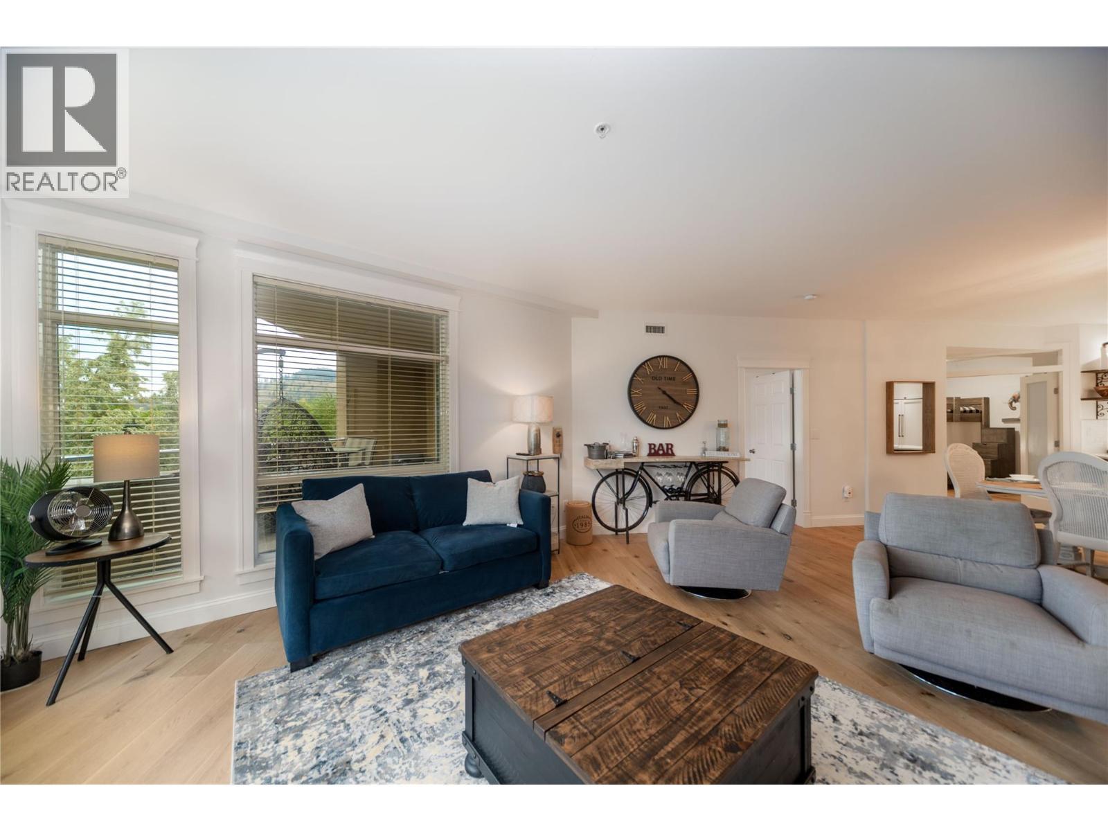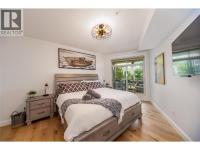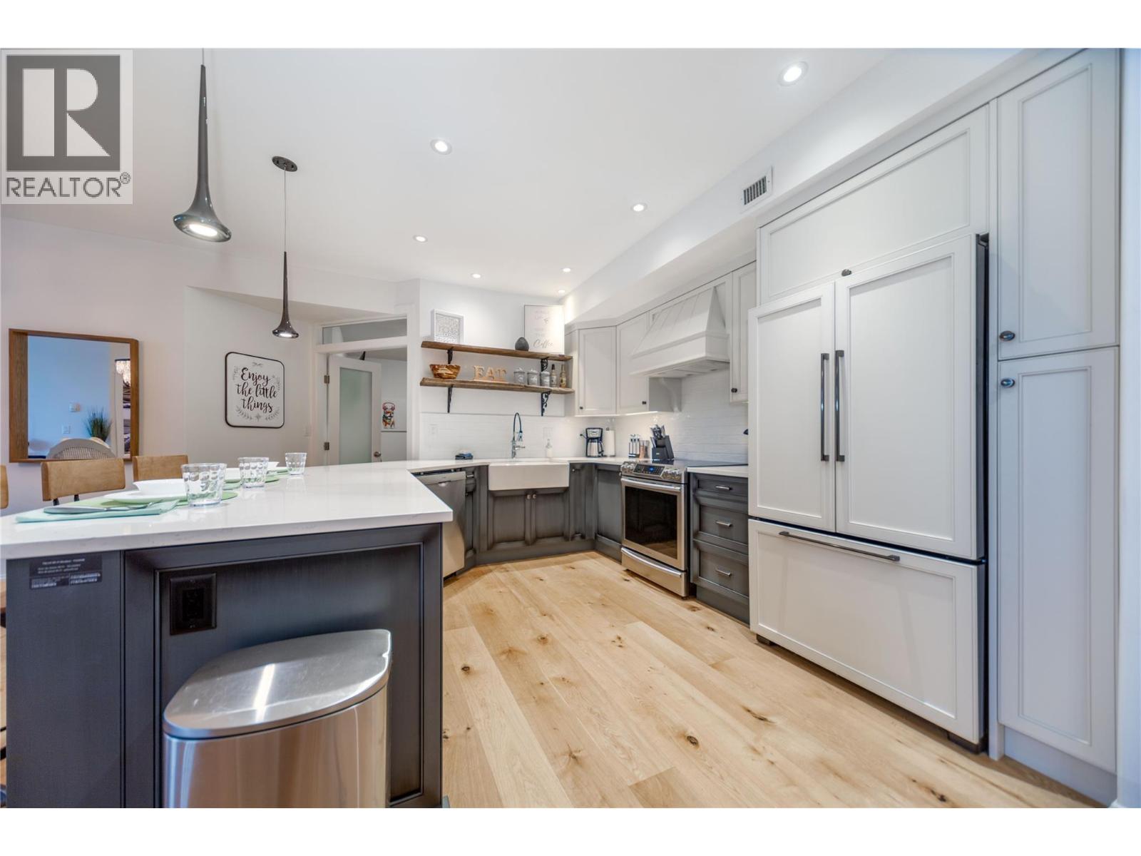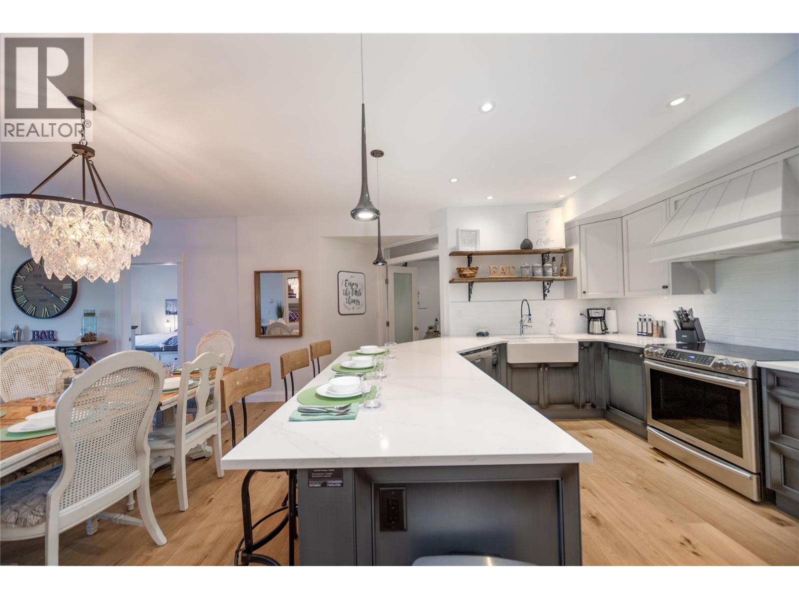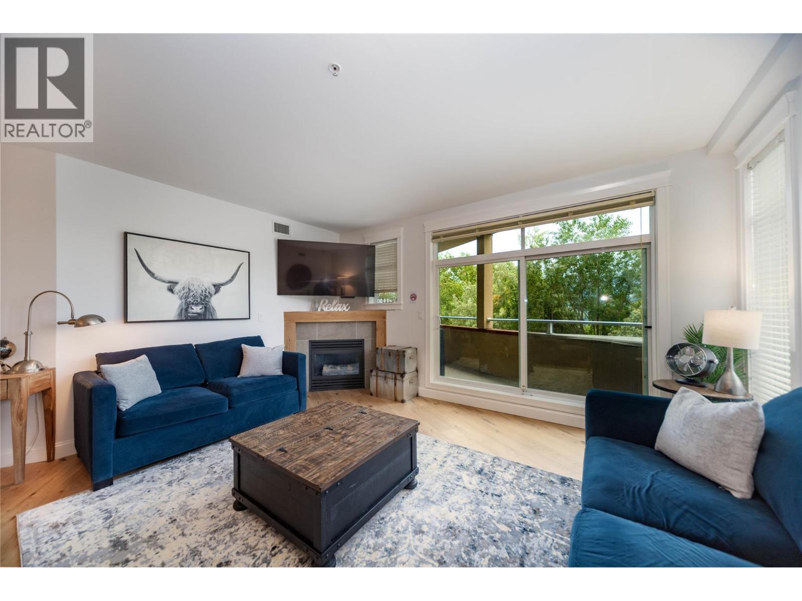 Renovated 3-bed 2-bath suite on the peaceful side of Discovery Bay, right on the shores of Lake Okanagan. With nearly 1,500 sq. ft. of thoughtfully designed living space, this home offers a rare combination of privacy, style, and location. Step inside to white oak engineered hardwood floors, a designer kitchen with custom two-tone cabinetry, quartz countertops, a Bosch whisper-quiet dishwasher, induction/convection oven, and updated lighting throughout. The open layout flows from the kitchen and dining area into the living room, where a tiled gas fireplace creates a warm focal point. Two private decks overlook the bird sanctuary and lush landscaping. Both bathrooms feature heated floors, with the primary ensuite showcasing a spacious walk-in shower. Residents enjoy premium amenities including two pools (one open year-round), two hot tubs, a sauna, fitness centre, and games room—all within walking distance to shops, restaurants, and the beach within the Cultural District. Secure underground parking is included. Pets allowed, 1 small dog or cat. (id:6769)