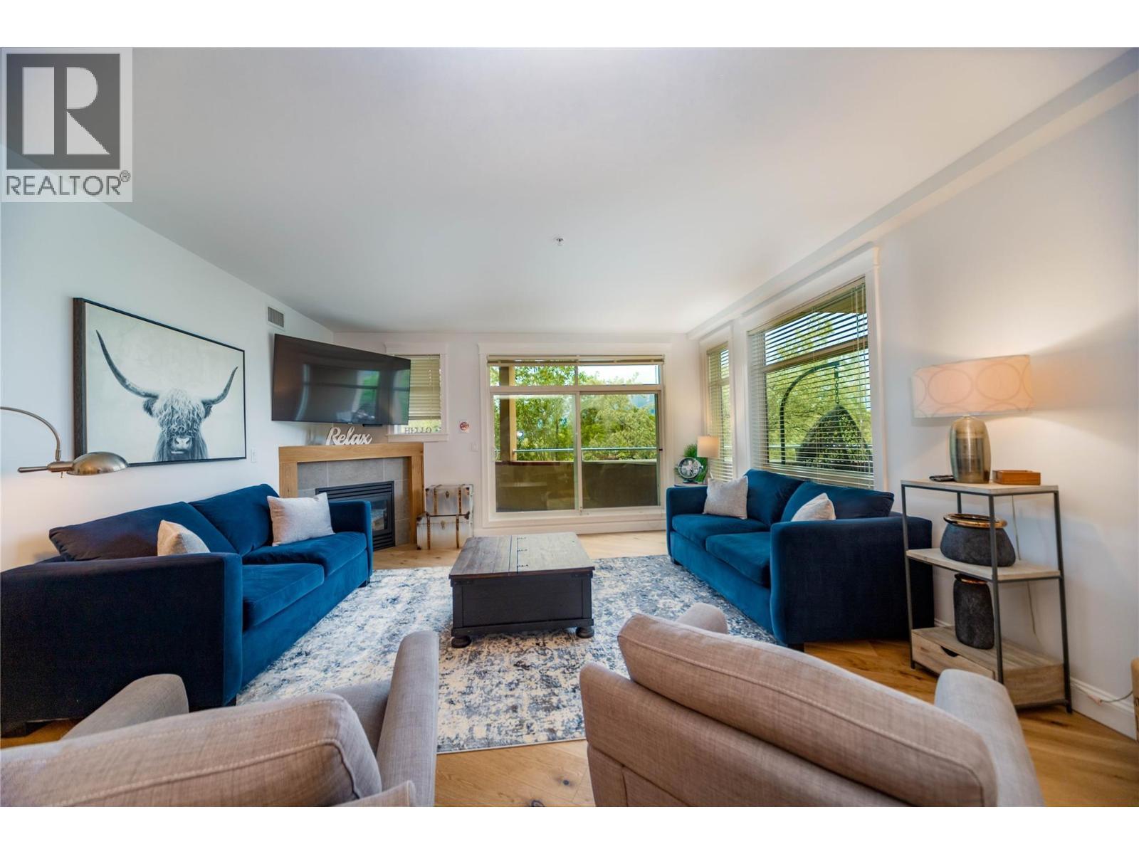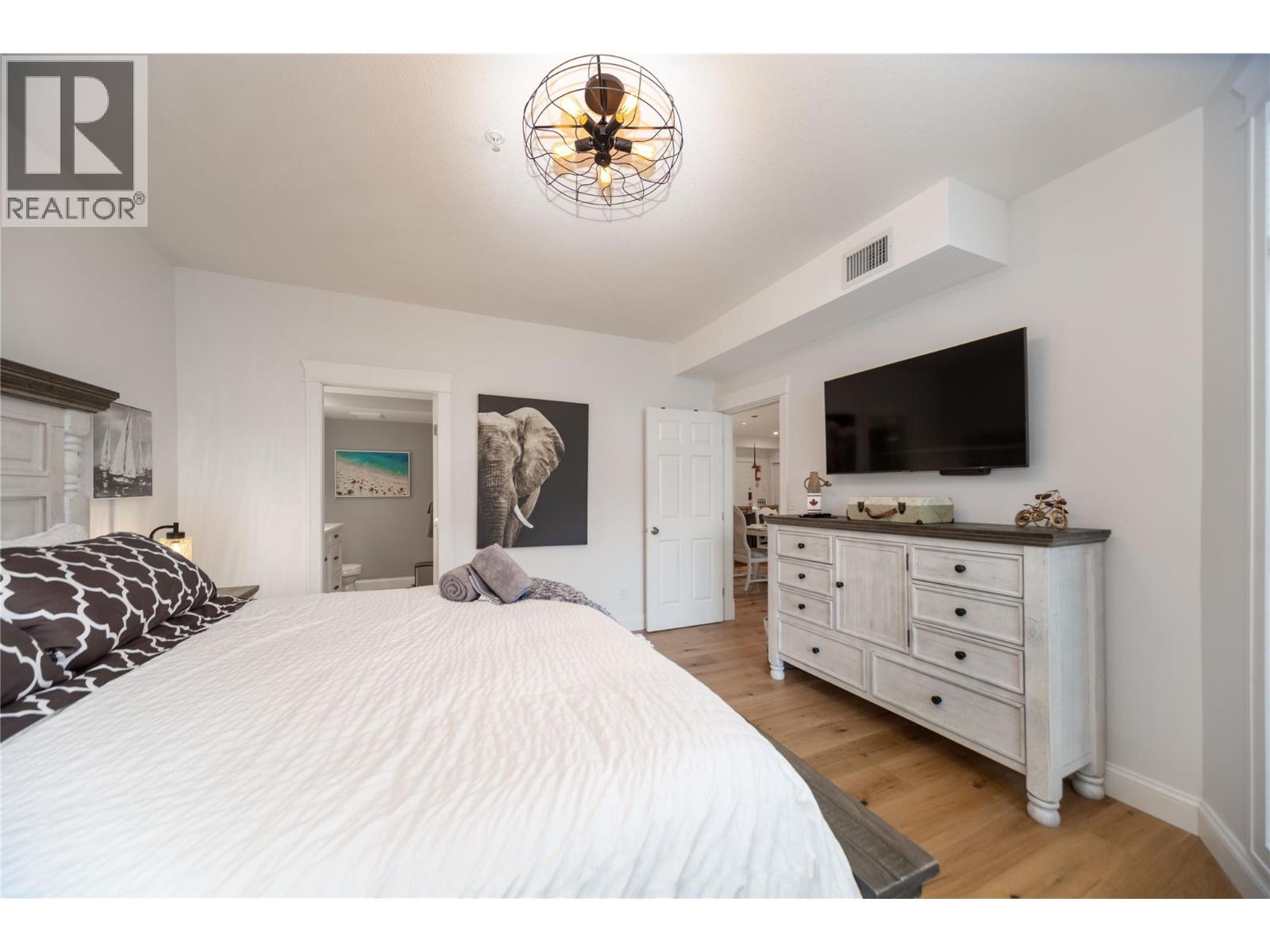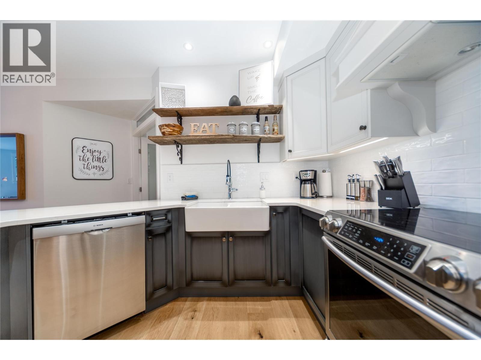 Renovated 3-bed 2-bath suite on the peaceful side of Discovery Bay, right on the shores of Lake Okanagan. With nearly 1,500 sq. ft. of thoughtfully designed living space, this home offers a rare combination of privacy, style, and location. Step inside to white oak engineered hardwood floors, a designer kitchen with custom two-tone cabinetry, quartz countertops, a Bosch whisper-quiet dishwasher, induction/convection oven, and updated lighting throughout. The open layout flows from the kitchen and dining area into the living room, where a tiled gas fireplace creates a warm focal point. Two private decks overlook the bird sanctuary and lush landscaping. Both bathrooms feature heated floors, with the primary ensuite showcasing a spacious walk-in shower. Residents enjoy premium amenities including two pools (one open year-round), two hot tubs, a sauna, fitness centre, and games room—all within walking distance to shops, restaurants, and the beach within the Cultural District. Secure underground parking is included. Pets allowed, 1 small dog or cat. (id:6769)