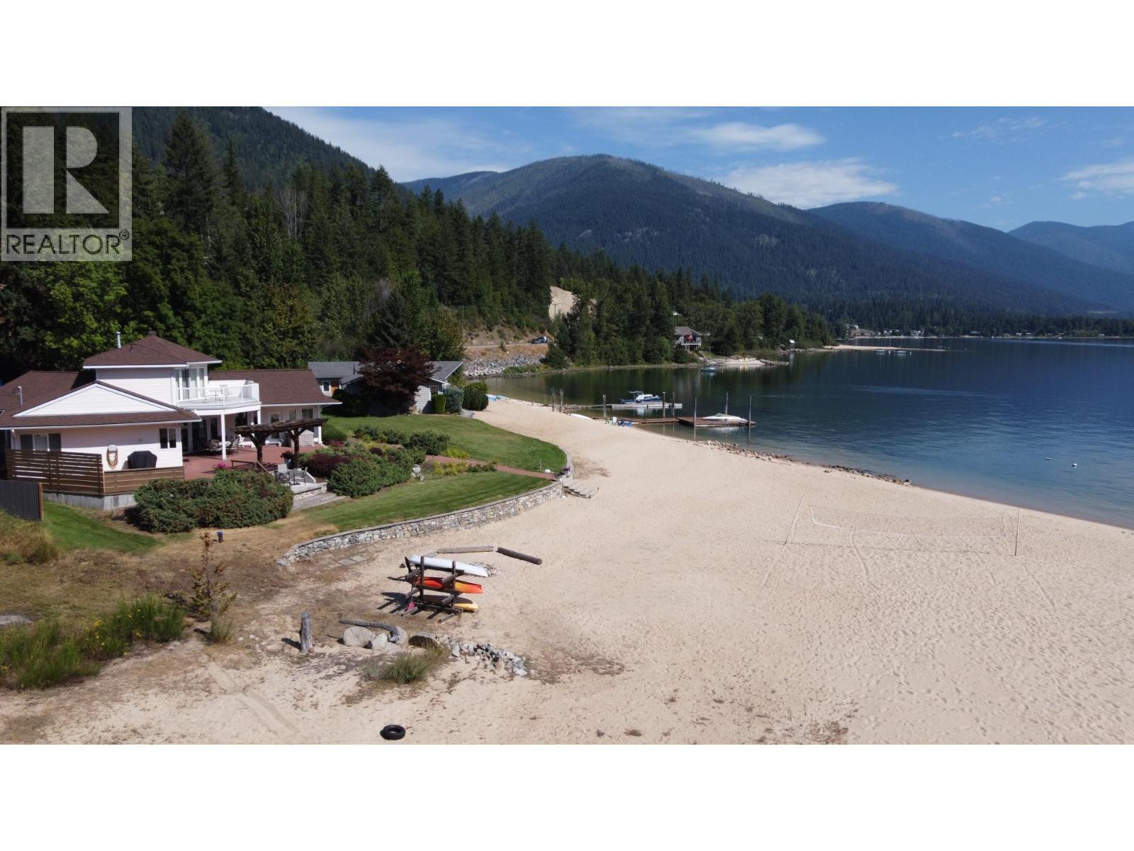One of the most iconic waterfront beaches on Kootenay Lake could now be yours. There is over 200' of sandy beach for you to use at the waterfront, and a full size volleyball court and more sand to enjoy. Year round you get to admire the lake from this beautiful custom designed 3 bedroom 2.5 bath home with spacious rooms and panoramic window plan. The home offers a primary suite in the top floor with jetted soaker tub and walk in shower ensuite, walk in closet and private balcony, while the main floor has a wing with the other 2 large bedrooms and a full bathroom, then the large living room, dining and kitchen all taking advantage of the views and lastly the den, laundry and 2 pce bathroom. The basement is unfinished, below grade and offers more storage than anyone could need and possible development into a media room or rec area for kids. Located 8 mins from Nelson, along the N. Shore, the property offers room for a future garage or covered parking. Enjoyed by 1 family for the last 40 yrs this property is a gem for Kootenay Lake waterfront living. (id:6769)