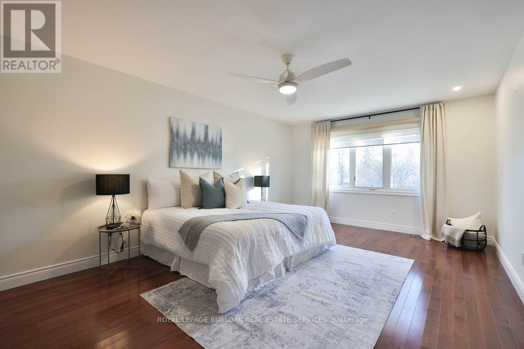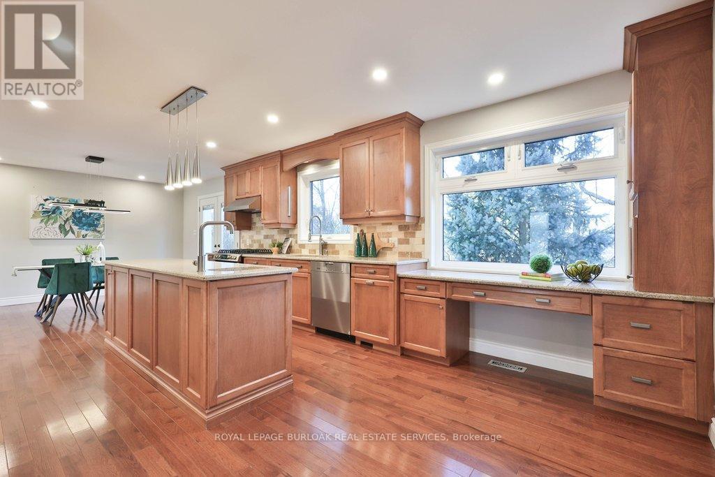 Nestled on a picturesque, tree-lined street in sought-after Shoreacres, this updated family home delivers the lifestyle South Burlington is known for. Backing on Shoreacres Creek, and located within the highly regarded Tuck and Nelson school districts and just steps to multiple neighbourhood parks, this is a setting designed for families. Enjoy easy walks to Glen Afton, Strathcona, and Nelson Park, with the lake and waterfront trails only mins away, perfect for evening strolls, biking, and adventures. Exceptional curb appeal welcomes you home, highlighted by a custom oversized Dako front door, new exterior lighting, fencing, and thoughtfully planted trees and perennial gardens. Inside, premium upgrades and timeless finishes create warm, functional living spaces. Hardwood floors flow throughout, complemented by new LED pot lights and custom Hunter Douglas blinds. The welcoming entry features travertine tile, while the living and dining rooms set the stage for family gatherings. A private home office makes working from home effortless, while the family room offers heated floors and convenient garage access. The chef's kitchen is the heart of the home, featuring granite countertops, premium stainless steel appliances, pantry storage, a breakfast nook, and walkout to the backyard. A renovated powder room and a laundry room with yard access add everyday convenience. Upstairs, hardwood floors continue throughout. The primary suite includes a walk-in closet and a renovated ensuite with heated floors. Three additional well-sized bedrooms and a main bathroom with heated floors provide comfort for the whole family. The professionally landscaped backyard is a true oasis, featuring stone patios and walkway, a Napoleon gas fire pit, and a hot tub - an ideal space for entertaining or unwinding year-round. A rare blend of location, lifestyle, and thoughtful upgrades in one of Burlington's most beloved neighbourhoods. (id:6769)