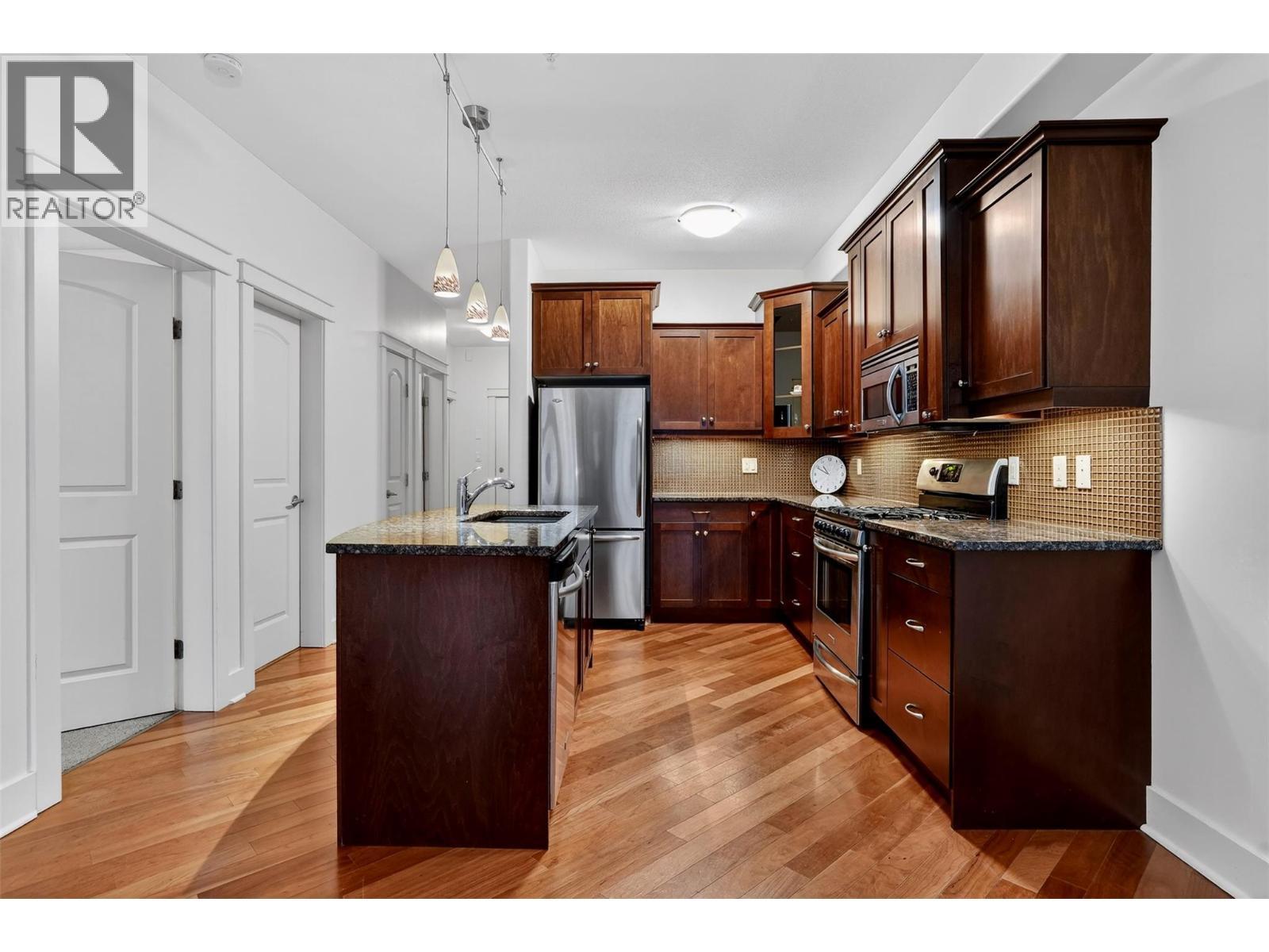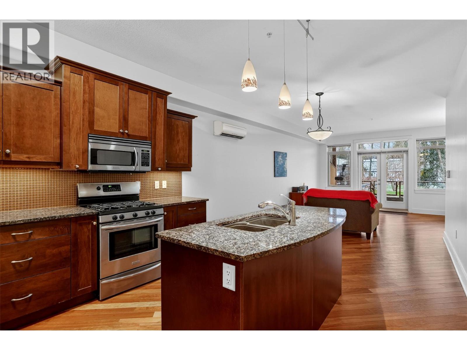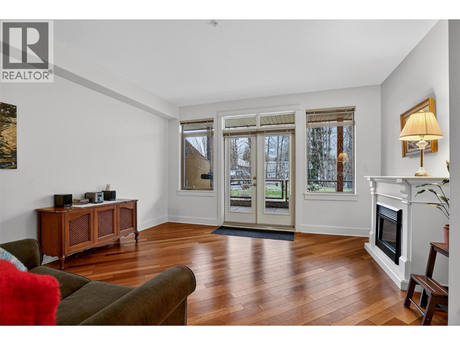 Experience sophisticated living in this exquisite main floor unit, ideally situated in the much loved Fairview neighbourhood of Nelson. This immaculate 1 bedroom plus den residence is a true gem, featuring a comprehensive upgrade package that defines modern elegance. Revel in the warmth of cherry wood cabinets and rich hardwood flooring, complemented by a gourmet gas range and granite countertops. Located on the ground floor with separate entrance will give you total privacy and easy one floor living. This thoughtfully designed space with overheight ceilings is equipped with air conditioning for your comfort and an electric fireplace that adds a touch of coziness. The unit boasts a private walk-out covered patio with gas BBQ hookup, seamlessly connecting you to the meticulously landscaped grounds, perfect for serene outdoor living. Included are secure underground parking and a separate storage locker, ensuring your convenience and lifestyle needs are met. Residents enjoy exclusive access to a beautifully appointed common meeting room and washroom for events. Indulge in a lifestyle that merges luxury with recreation, all within moments of the stunning lakeside setting, walking path and the famous L and C French bakery cafe. Don’t miss the opportunity to claim this exceptional residence as your own. (id:6769)