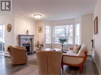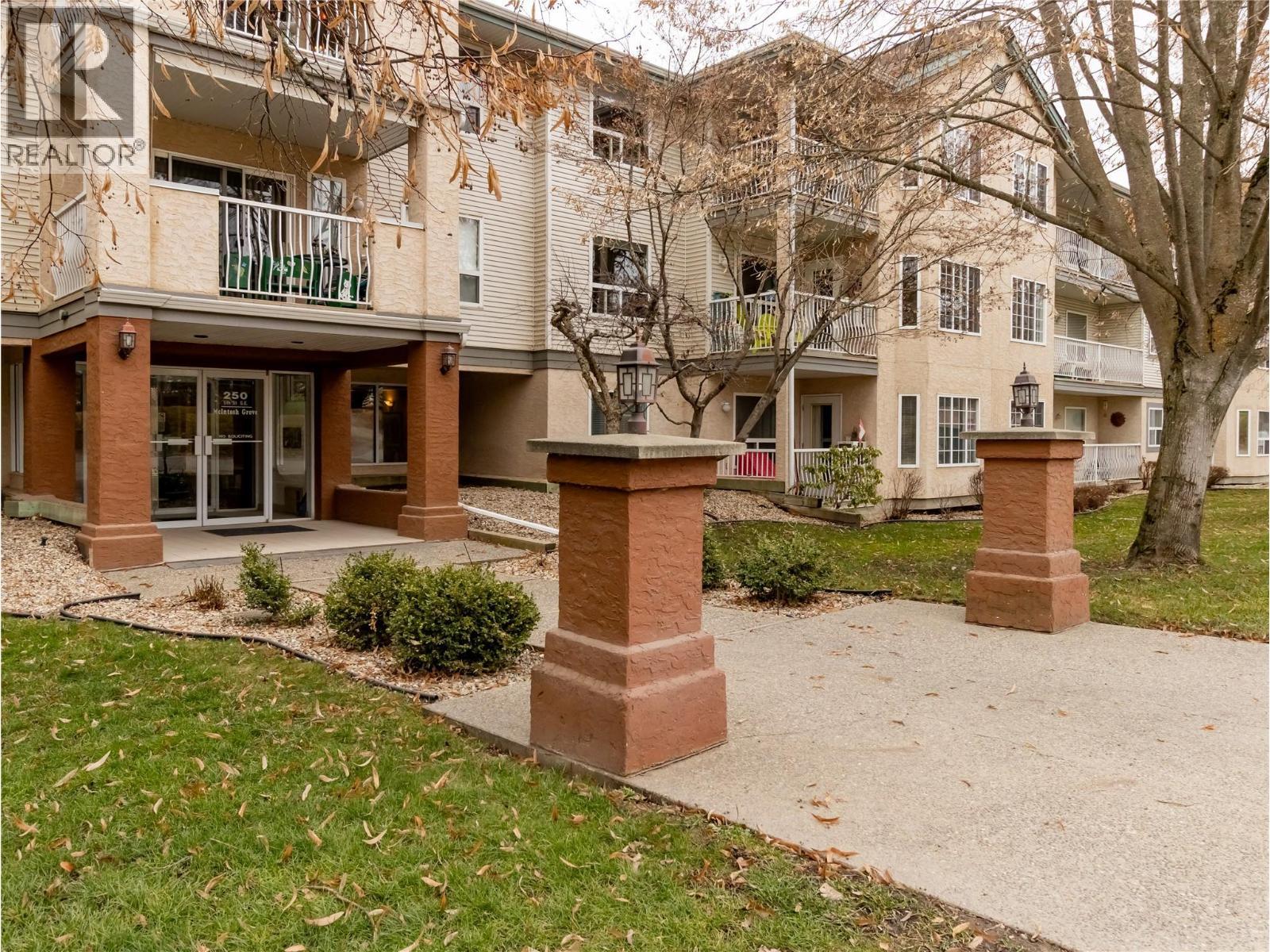 Tastefully renovated corner unit in the desirable 55+ MacIntosh Grove, offering easy, low-maintenance living just steps from downtown. This bright and spacious home features just under 1,300 sq. ft. with 2 bedrooms and 2 bathrooms, and has been recently updated with new flooring, a renovated kitchen with new appliances and countertops, fresh paint, and updated bathrooms. The inviting living room includes a newer AC unit, cozy gas fireplace (included in the strata fee) and flows seamlessly into the formal dining area and eat-in kitchen with access to a wrap-around, covered balcony featuring mountain views. The well-designed layout offers generous room sizes, a primary bedroom with walk-in closet and full ensuite (dual vanities). The kitchen provides ample cabinetry, tile backsplash, stainless appliances. A separate laundry room includes extra storage and room for a freezer. Convenient elevator access ensures effortless entry to this unit—simply move in and enjoy. MacIntosh Grove amenities include underground parking, RV parking, a common gathering room with kitchen, craft room, exercise room, and workshop. Public transit, shopping, restaurants, and downtown are all within walking distance. Quick possession available. All measurements and information are deemed correct but should be verified by the buyer. (id:6769)