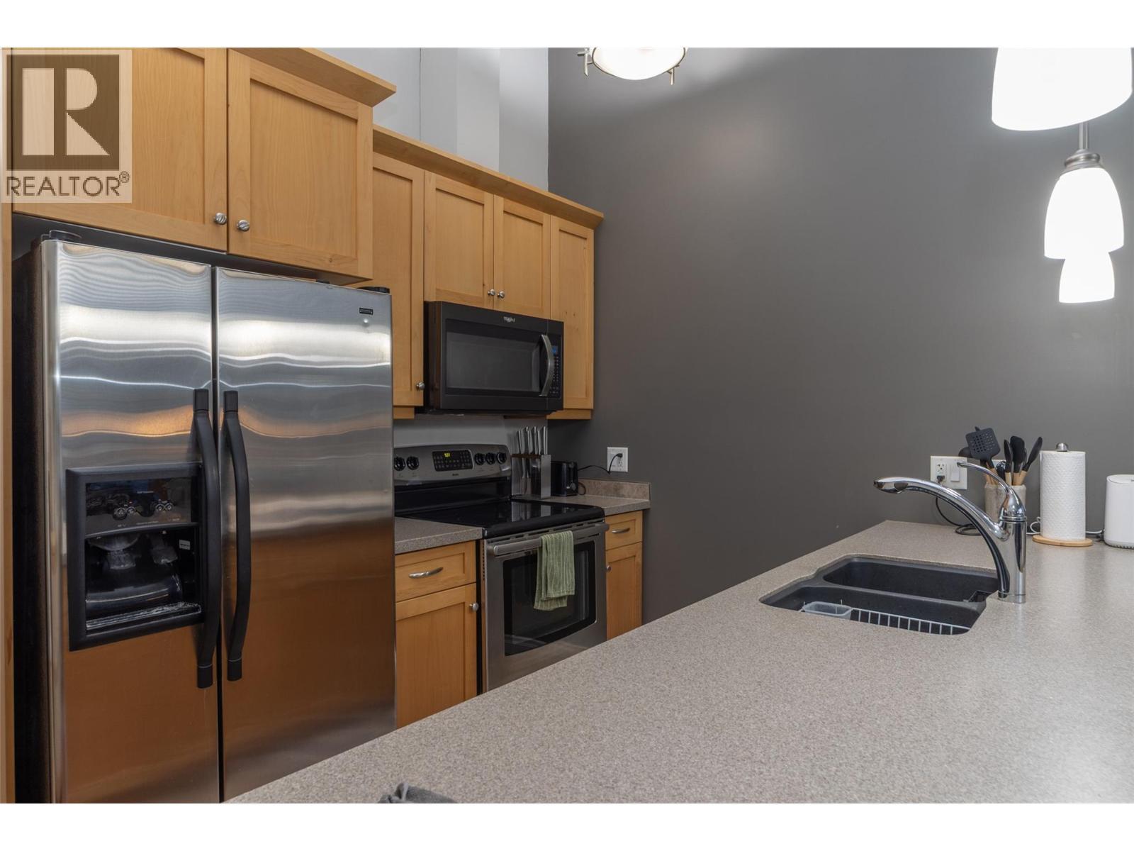 Rare top-floor loft available at the Verana Penticton. This highly regarded building is known for its proximity to the famous Skaha beach, shops, schools, and hospital. The Verana has wonderful amenities (gym, lounge, pool table, TV rm and party room+bbq patio) and is known for great neighbors. Quiet 4th flr 1 bdrm plus den (could serve as a 2nd guest bdrm), 1.5 baths, with open floor plan + soaring loft ceilings. Open kitchen perfect for entertaining. Stainless steel appliances. Brand new washer dryer. New paint in liv/dining room, updated floors in the bdrm+den. Shaded NE facing windows+deck that is ideal for staying out of the hot South Okanagan sun in the afternoons. Secure underground parking with a large storage locker right at your stall. Bike storage. BBQ's allowed and ample visitor parking. Well-run strata. New carpet+paint in the hallways. No long-term rental restrictions. Move-in ready for Spring 2026. (id:6769)