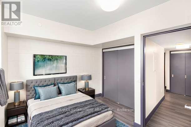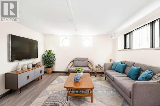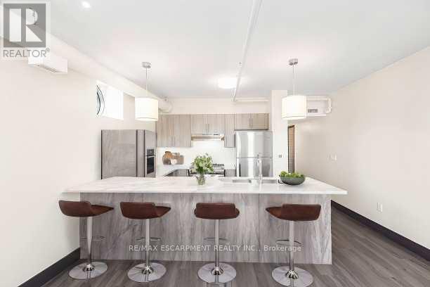 Downtown style at Gore Park lofts. Smack dab in the heart of Downtown Hamilton, this building brings together old-world charm and modern living. Great outdoor spaces surround you, with nearby parks, scenic bike trails and the lakeshore just a short jog away. Inside, the unit blends character with modern style. This spacious two-bedroom unit is carpet-free throughout! Enjoy the convenience of a gourmet kitchen with loads of counter space and a breakfast bar that flows into a large living space with tons of potential. A generous primary bedroom is complemented by a nicely sized second bedroom, room for all! There is a gleaming white four-piece bathroom with subway tiles, in-suite laundry and a storage locker perfect for all the things we tend to collect to round out this great apartment. Located in a vibrant neighborhood with shops, restaurants and entertainment, all within walking distance. Close to the GO station, HWY 403, McMaster University and Mohawk College. This home puts you in the middle of everything. Welcome home! RSA. (id:6769)
