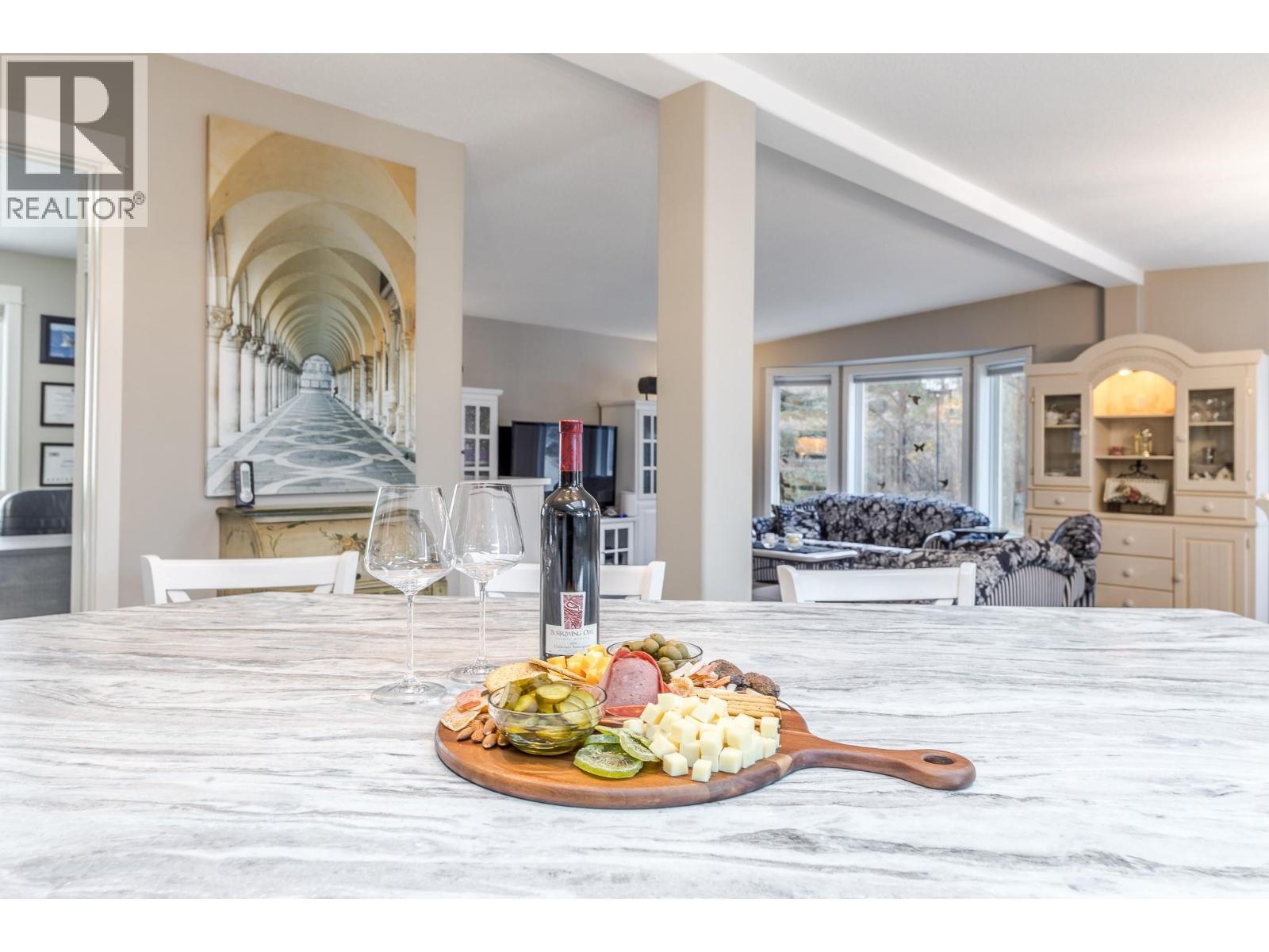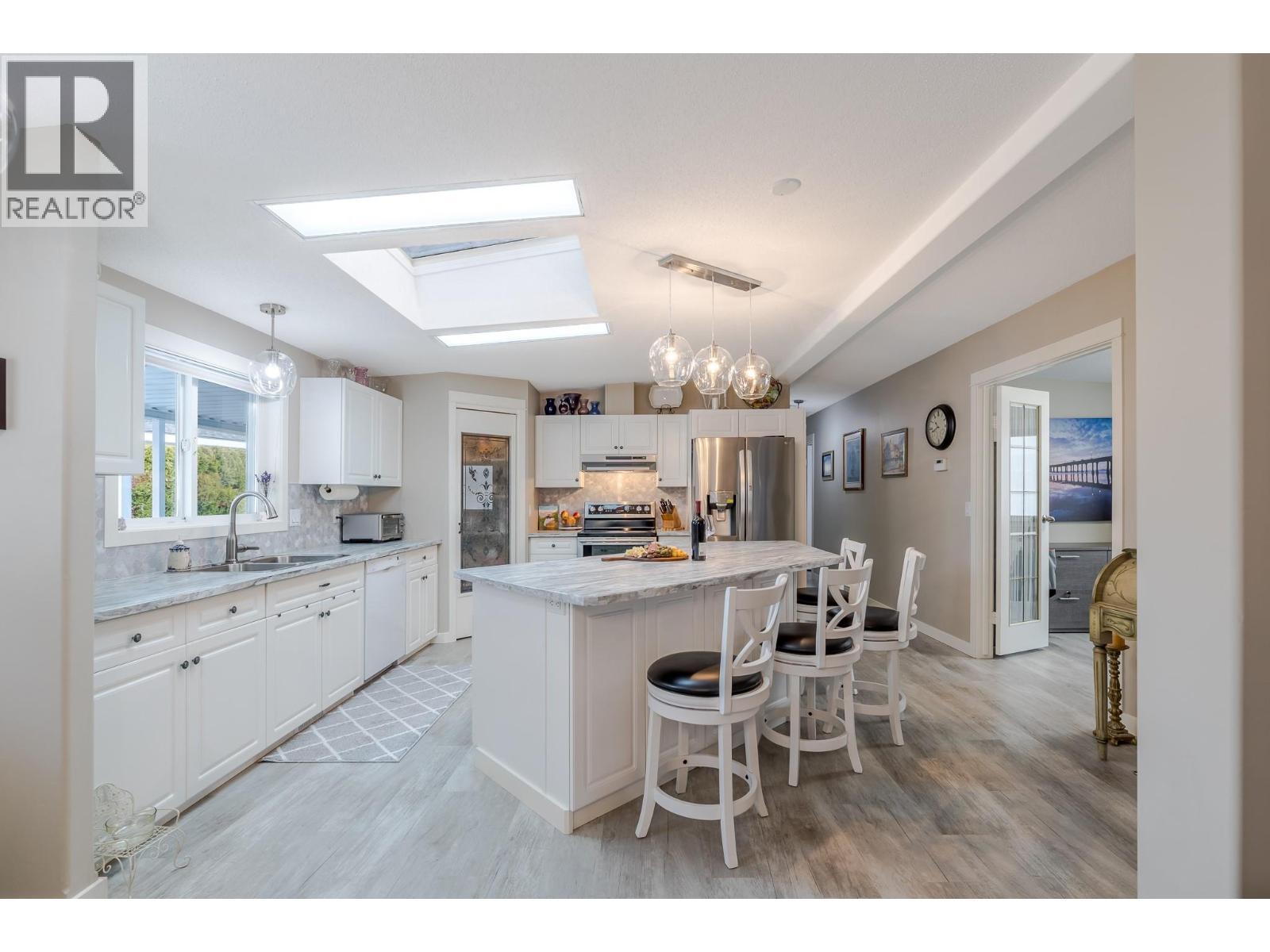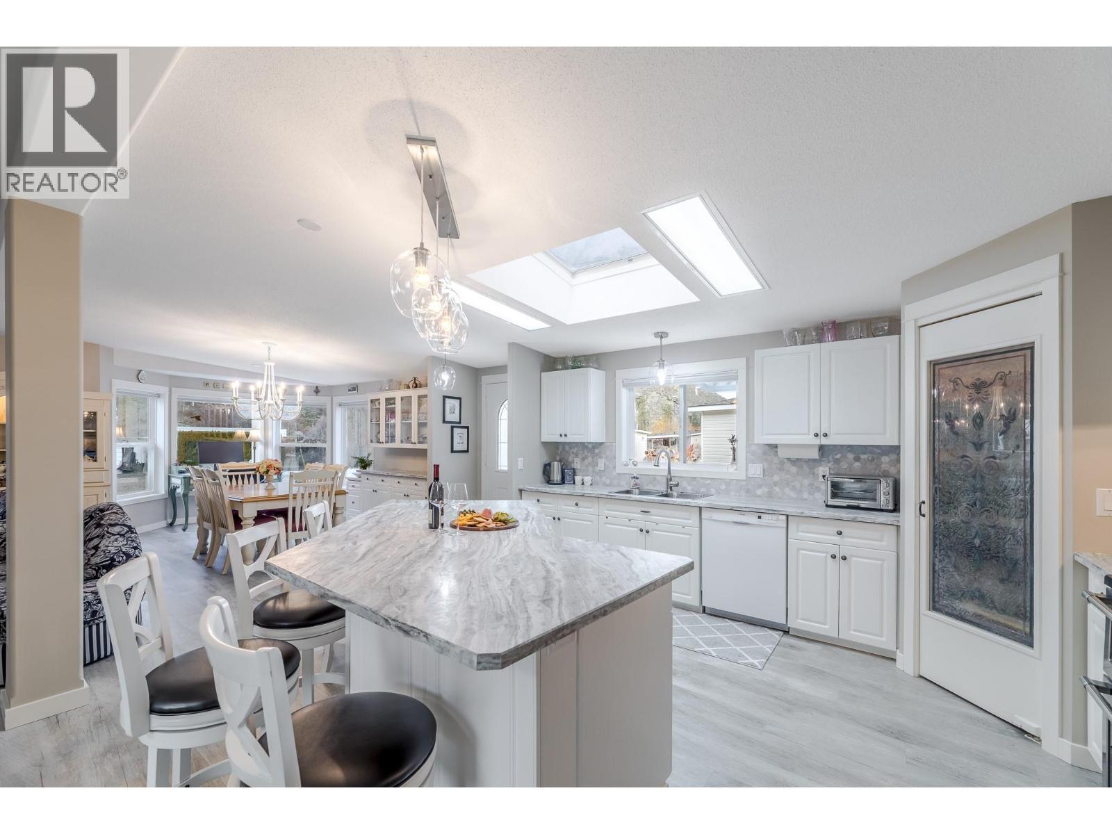 Wake up where the river whispers and the valley stretches wide. In Deer Park Estates, this rare double wide invites you to own the land beneath your feet and slow life down just enough to enjoy it. With 1,521 sq ft, this beautifully updated 3 bedroom, 2 bathroom home opens into a bright, open concept living space finished with new vinyl flooring and thoughtful hexagon details, from the marble kitchen and laundry backsplash to the patterned pavers in the backyard. Step outside and feel the calm of a quiet riverside neighborhood, where morning walks follow the trail to the dam and evenings are framed by views of the McIntyre Bluffs. This is bare land strata living at its best, with an exceptionally low $55 per month strata fee that includes common area maintenance and access to a welcoming clubhouse featuring pool tables, a meeting space, and a full kitchen with deck and BBQs, perfect for hosting friends and neighbors. RV or boat storage is available within the park, and a fenced dog park adds to the lifestyle appeal. Rarely does a double wide manufactured home on owned land come available in Deer Park Estates, especially one that blends space, updates, scenery, and quiet living so effortlessly. This is more than a home, it is a place to exhale, settle in, and enjoy the Okanagan way of life. LOTS OF STORAGE. (id:6769)