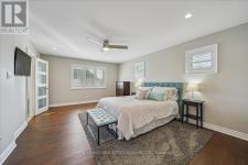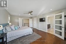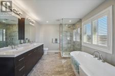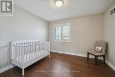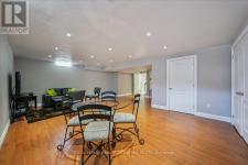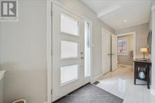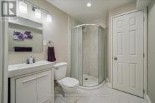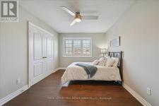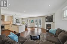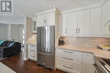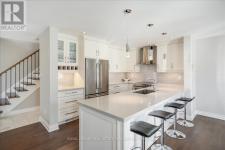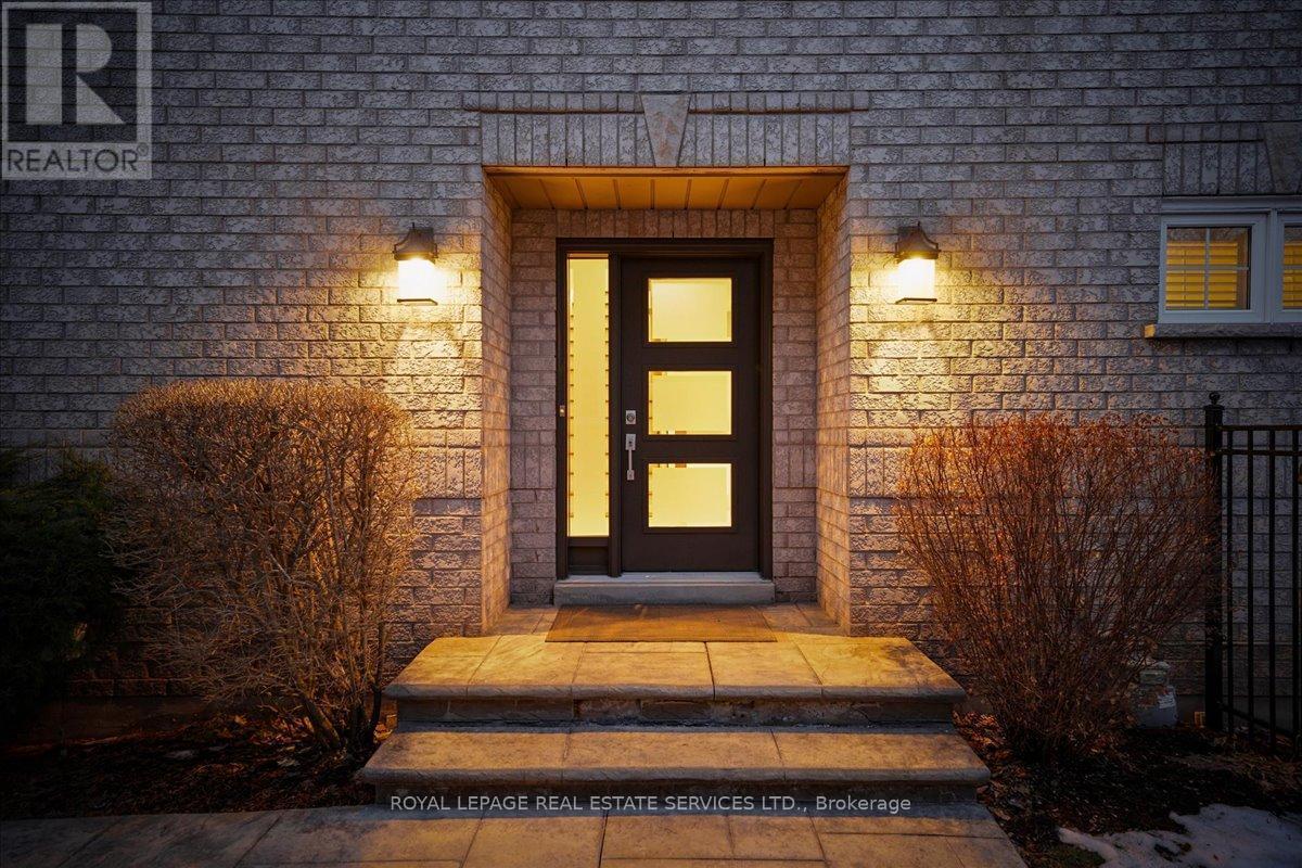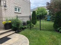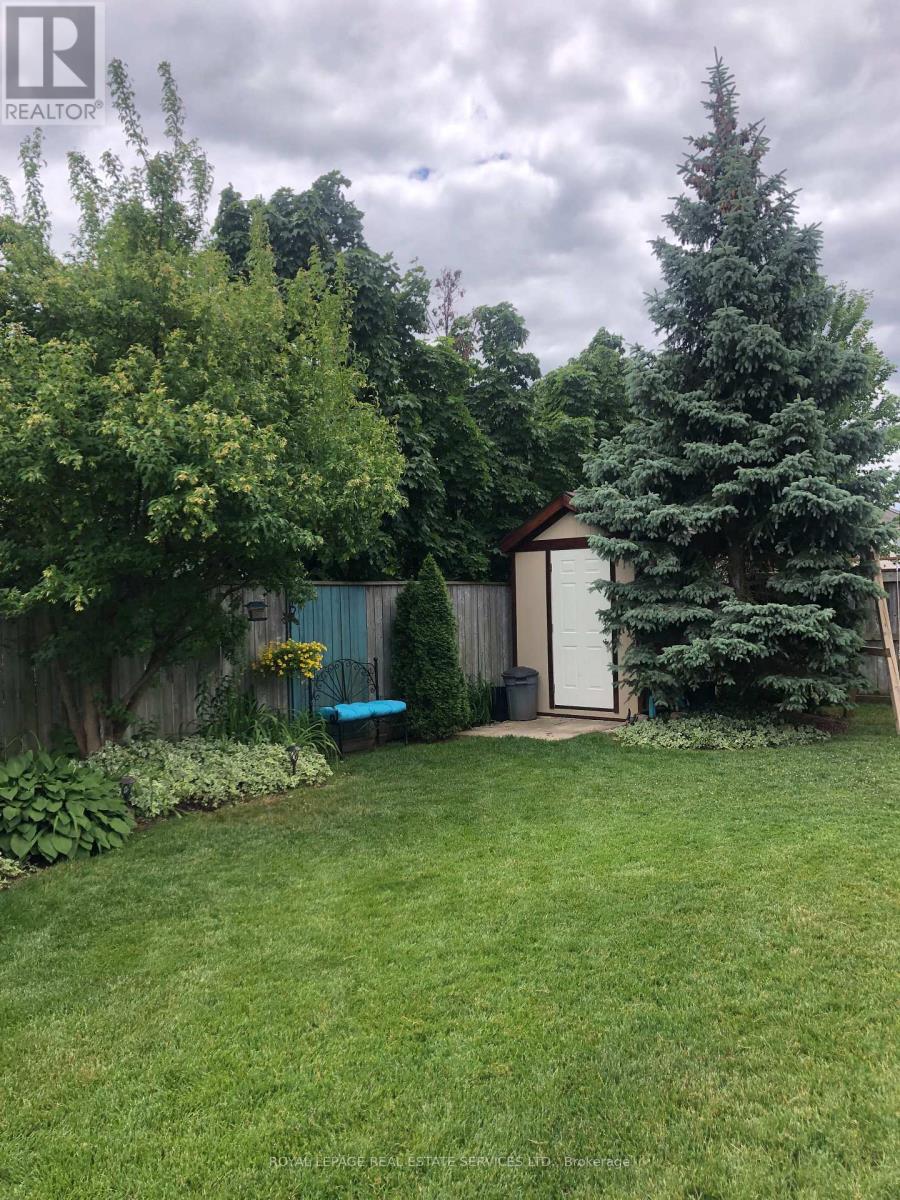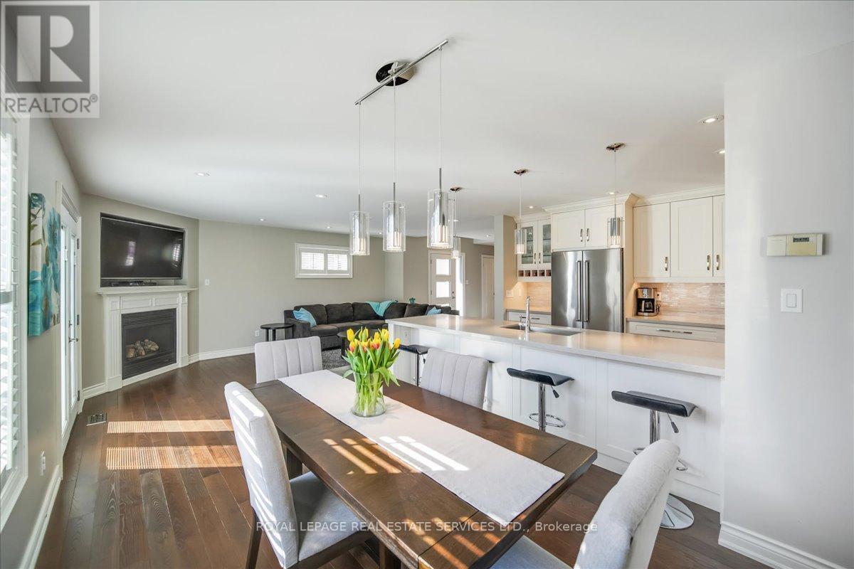 This exceptional freehold end-unit townhome lives like a semi-detached and sits on a rare oversized pie-shaped lot framed by mature trees, offering remarkable outdoor space seldom found in this style of home. Complete with a double car garage and a driveway accommodating up to four vehicles, the property combines space, privacy, and convenience. Designed with 3 bedrooms and 3+1 bathrooms, the home features a bright open-concept layout ideal for both entertaining and everyday living, with hardwood flooring throughout. The main level showcases spacious living and dining areas filled with natural light, pot lights throughout, and a gas fireplace with a classic white mantel and wall-mounted TV above. The designer kitchen, renovated in 2018, features custom cabinetry, quartz countertops, and a large peninsula with an undermount sink and breakfast bar seating beneath modern pendant lighting. Premium stainless steel KitchenAid appliances include a refrigerator, induction range, custom panel dishwasher, and sleek range hood, complemented by a stylish tile backsplash and built-in wine storage with glass display cabinets. A convenient laundry room with cabinetry, laundry sink, and inside access to the double car garage completes the main level. Upstairs, three spacious bedrooms include a beautiful primary retreat with a spa-inspired 5-piece ensuite featuring a freestanding soaker tub, oversized glass walk-in shower with rainfall showerhead, and double vanity with quartz countertop. A well-appointed 4-piece bathroom serves the additional bedrooms. The finished lower level offers a large recreation room with pot lights, a 3-piece bathroom, and generous storage. Outside, the expansive pie-shaped backyard features a patterned concrete patio and walkway, gas BBQ hookup, and custom garden shed. Ideally located just moments from scenic trails along 16 Mile Creek and within walking distance to both public and Catholic elementary schools. (id:6769)