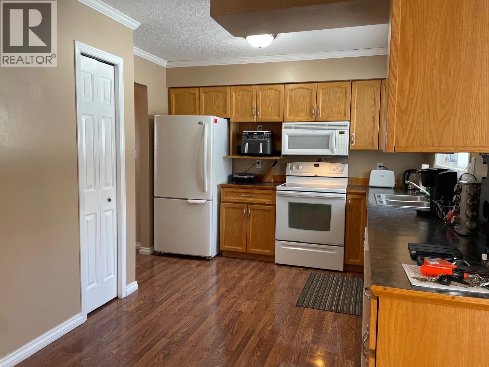 Don't miss out on this terrific find! Sweetly nestled into a corner of Fort Nelson's best neighbourhood, you'll find a neat wedge-shaped lot backing onto a greenbelt with access to forested trails. The yard is smartly landscaped with a large deck, walkways and chain-link fencing. This home welcomes residents and guests into a spacious foyer with double closets, and then flows sensibly into living and dining spaces featuring wide archways that allow light and life to extend throughout. The kitchen offers an abundance of classic oak cabinetry and functional design/layout. Three main floor bedrooms include a primary with walk-in closet and 2-piece ensuite. Downstairs there is an awesome L-shaped rec room/family room, plus fourth bedroom, office laundry and full bathroom. An efficient tandem 2-car garage with power and heat rounds out the package. (id:6769)